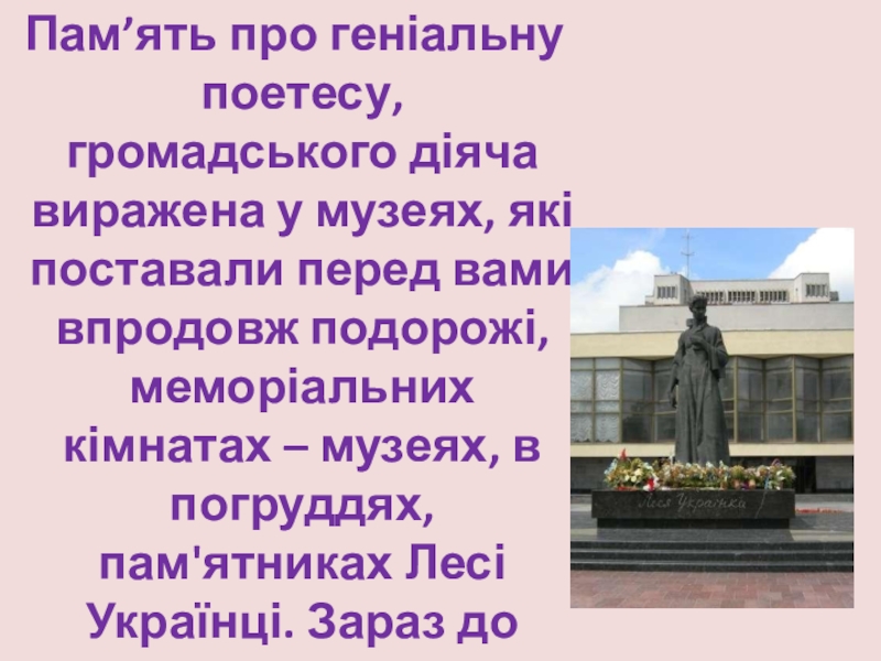 Слайд 69 Пам’ять про геніальну поетесу, громадського діяча виражена у музеях, які