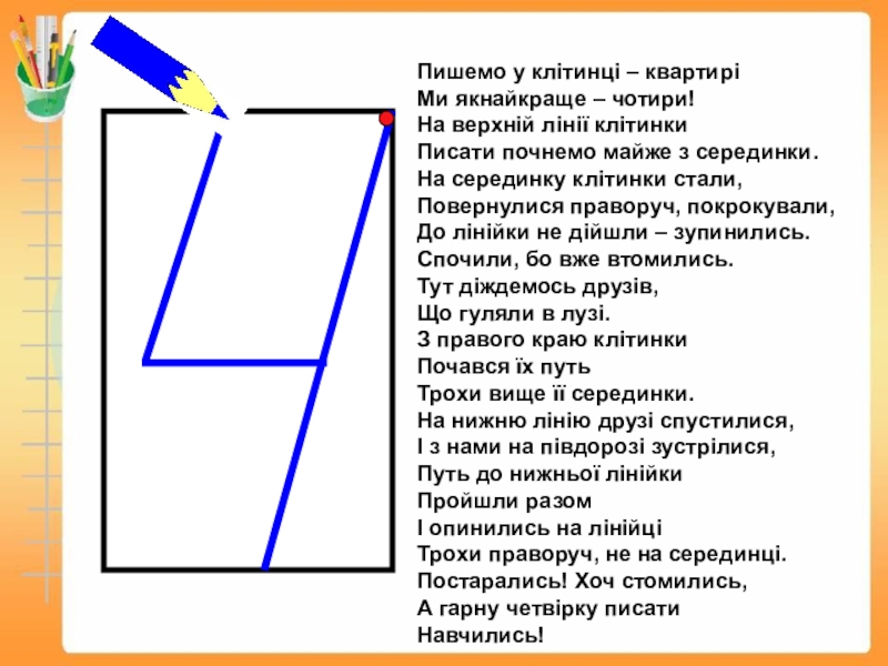 почнемо майже з серединки. На серединку клітинки стали, Повернулися праворуч, покрокували, До лінійки не дійшли – зупинились. Спочили, бо вже втомились. Тут діждемось друзів, Що гуляли в лузі. З правого краю клітинки Почався їх путь Трохи вище її серединки. На нижню лінію друзі спустилися, І з нами на півдорозі зустрілися, Путь до нижньої лінійки Пройшли разом І опинились на лінійці Трохи праворуч, не на серединці. Постарались! Хоч стомились, А гарну четвірку писати Навчились!