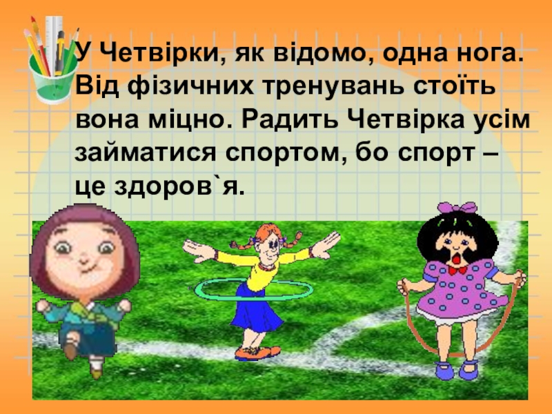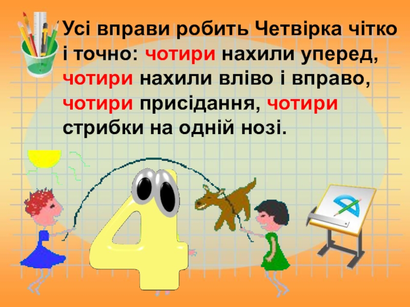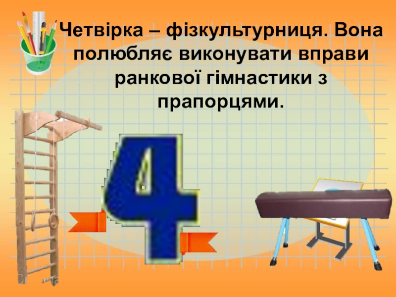 Слайд 2Четвірка – фізкультурниця. Вона полюбляє виконувати вправи ранкової гімнастики з прапорцями.