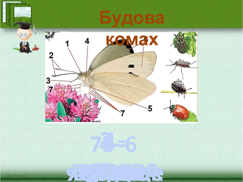 Будова комах1 - голова2 - вусики3 - хоботок4 - груди5 - черевце6 - крила7 – 6 ніжок