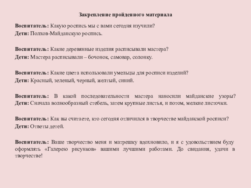 Воспитатель: Ваше творчество меня и матрешку вдохновило, и я с удовольствием буду оформлять «Галерею рисунков» вашими лучшими работами. До свидания, удачи в творчестве!