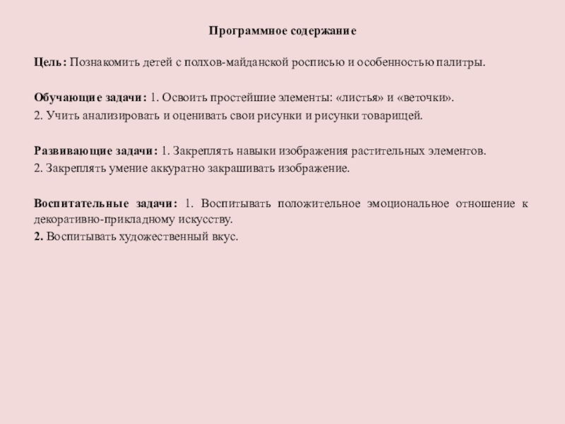 Воспитательные задачи: 1. Воспитывать положительное эмоциональное отношение к декоративно-прикладному искусству.