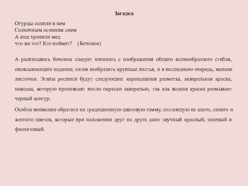 А расписывать бочонок следует начинать с изображения общего волнообразного стебля, опоясывающего изделие, затем изобразить крупные листья, и в последнюю очередь, мелкие листочки. Этапы росписи будут следующие: карандашная разметка, акварельная краска, наводка, которую производят после окраски акварелью, так как водная краска размывает черный контур.