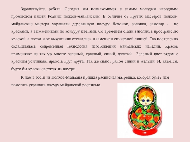 Слайд 4 Здравствуйте, ребята. Сегодня мы познакомимся с самым молодым народным промыслом нашей