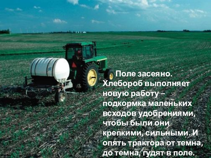 Слайд 10 Поле засеяно. Хлебороб выполняет новую работу –