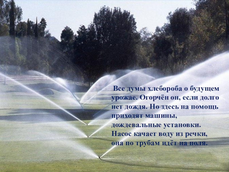 нет дождя. Но здесь на помощь приходят машины, дождевальные установки. Насос качает воду из речки, она по трубам идёт на поля.