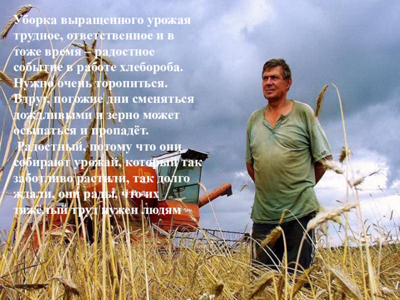 Слайд 13Уборка выращенного урожая трудное, ответственное и в тоже время – радостное