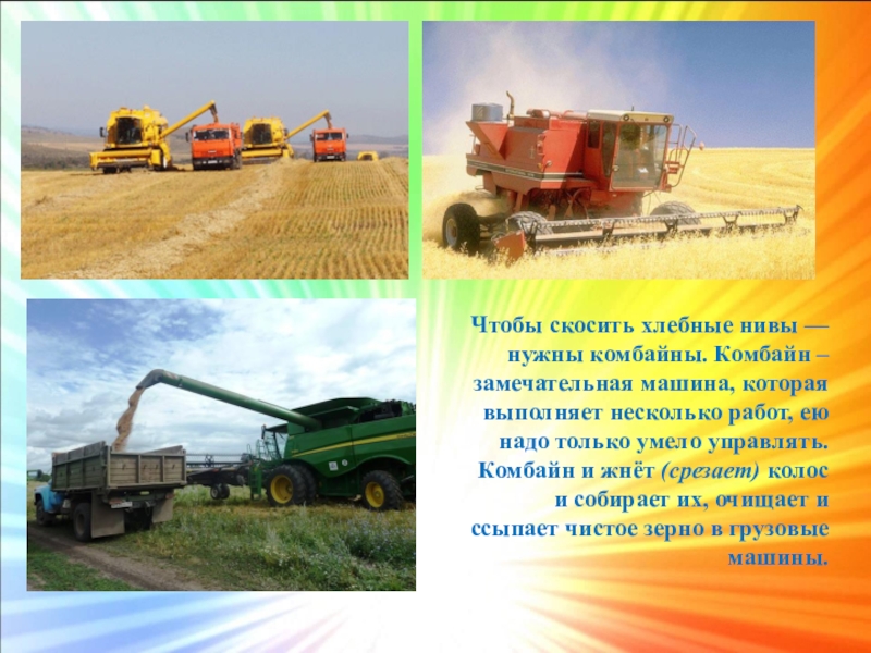 Слайд 14Чтобы скосить хлебные нивы — нужны комбайны. Комбайн – замечательная машина,