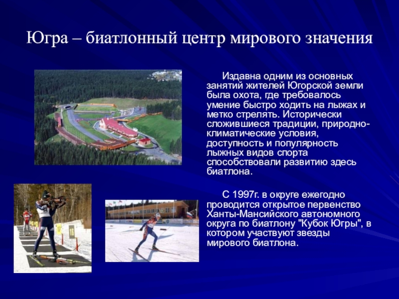 Югорской земли была охота, где требовалось умение быстро ходить на лыжах и метко стрелять. Исторически сложившиеся традиции, природно-климатические условия, доступность и популярность лыжных видов спорта способствовали развитию здесь биатлона.