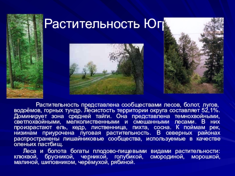 горных тундр. Лесистость территории округа составляет 52,1%. Доминирует зона средней тайги. Она представлена темнохвойными, светлохвойными, мелколиственными и смешанными лесами. В них произрастают ель, кедр, лиственница, пихта, сосна. К поймам рек, низинам приурочена луговая растительность. В северных районах распространены лишайниковые сообщества, используемые в качестве оленьих пастбищ.