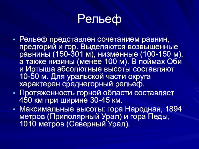 м), низменные (100-150 м), а также низины (менее 100 м). В поймах Оби и Иртыша абсолютные высоты составляют 10-50 м. Для уральской части округа характерен среднегорный рельеф.