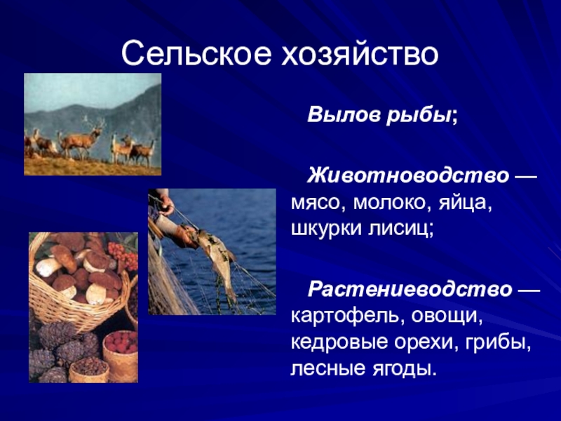 Животноводство — мясо, молоко, яйца, шкурки лисиц;