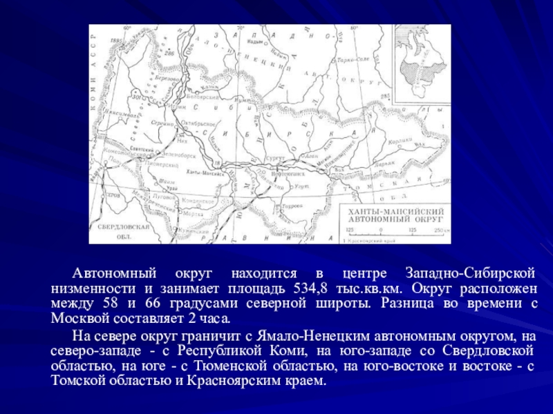 Слайд 8Автономный округ находится в центре Западно-Сибирской низменности и занимает площадь 534,8