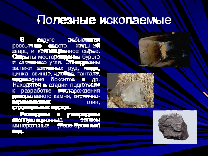 В округе добывается россыпное золото, жильный кварц и коллекционное сырье.
