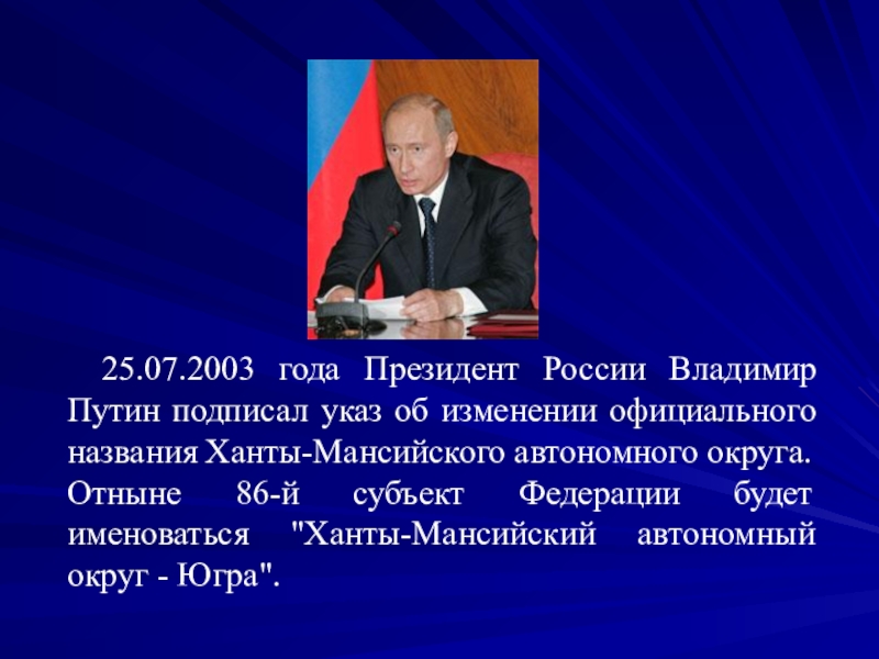 Слайд 425.07.2003 года Президент России Владимир Путин подписал указ об изменении официального