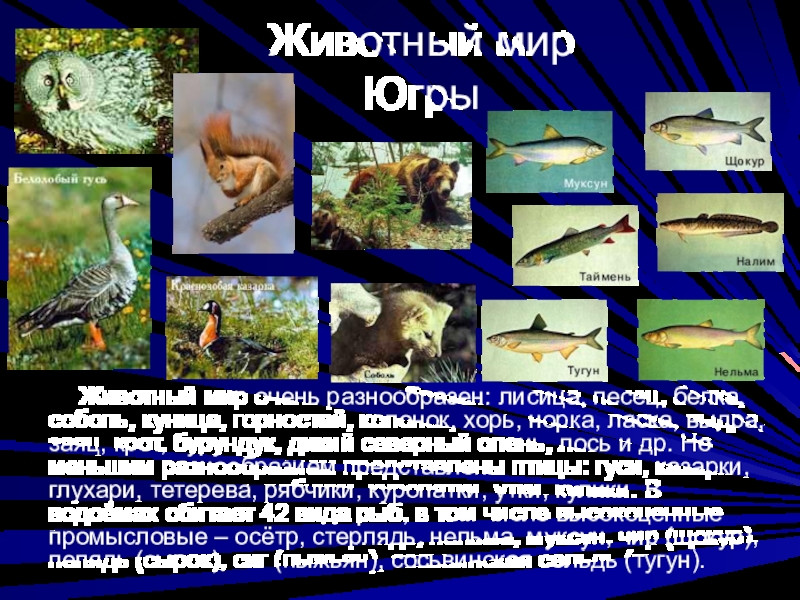 горностай, колонок, хорь, норка, ласка, выдра, заяц, крот, бурундук, дикий северный олень, лось и др. Не меньшим разнообразием представлены птицы: гуси, казарки, глухари, тетерева, рябчики, куропатки, утки, кулики. В водоёмах обитает 42 вида рыб, в том числе высокоценные промысловые – осётр, стерлядь, нельма, муксун, чир (щокур), пелядь (сырок), сиг (пыжьян), сосьвинская сельдь (тугун).