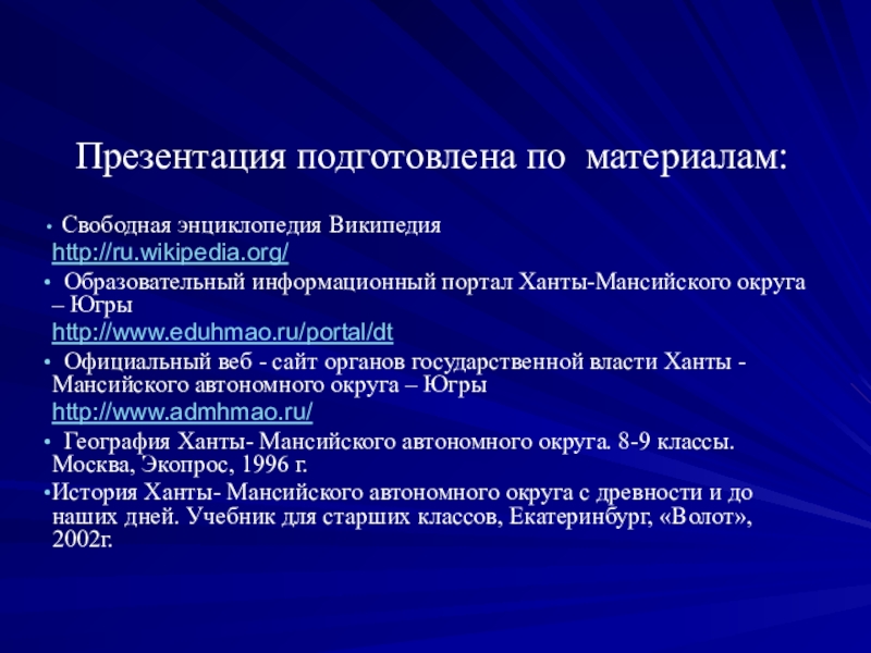 История Ханты- Мансийского автономного округа с древности и до наших дней. Учебник для старших классов, Екатеринбург, «Волот», 2002г.