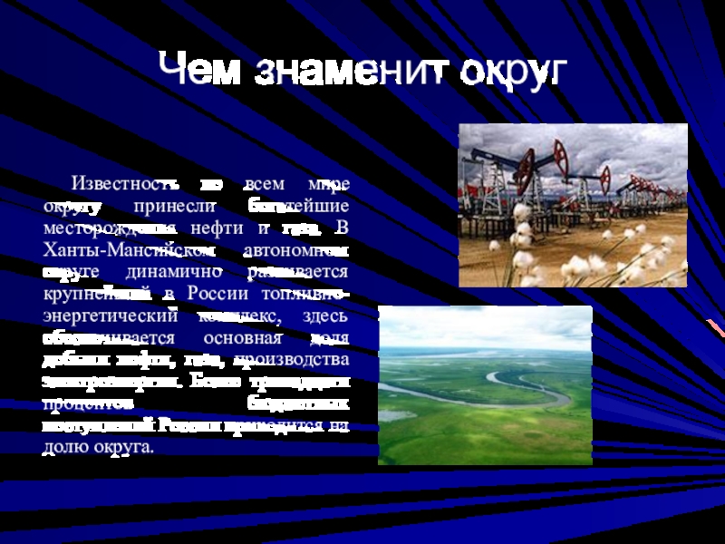 и газа. В Ханты-Мансийском автономном округе динамично развивается крупнейший в России топливно-энергетический комплекс, здесь обеспечивается основная доля добычи нефти, газа, производства электроэнергии. Более тринадцати процентов бюджетных поступлений России приходится на долю округа.