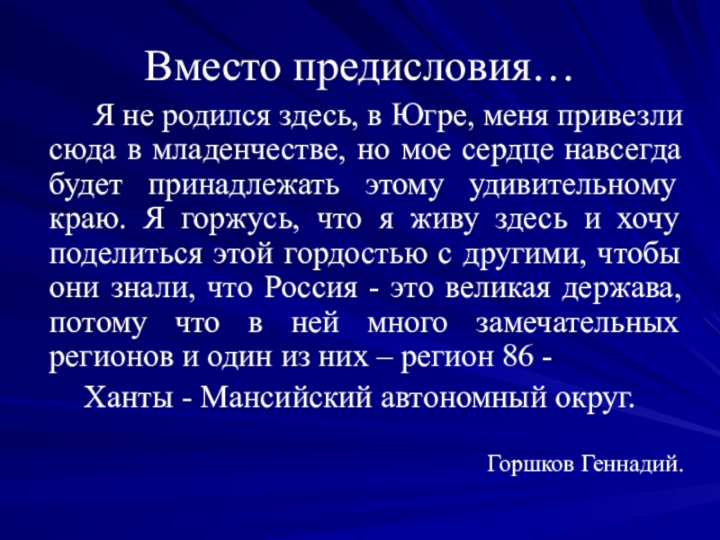 в младенчестве, но мое сердце навсегда будет принадлежать этому удивительному краю. Я горжусь, что я живу здесь и хочу поделиться этой гордостью с другими, чтобы они знали, что Россия - это великая держава, потому что в ней много замечательных регионов и один из них – регион 86 -