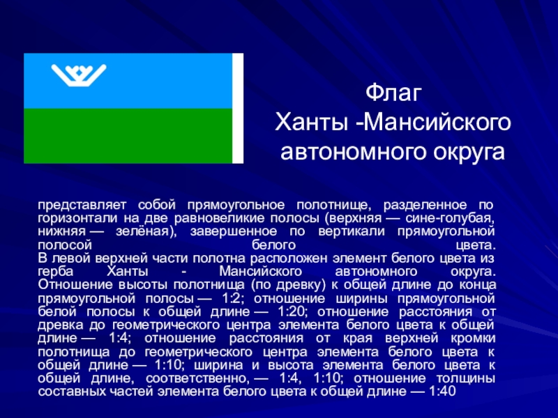 В левой верхней части полотна расположен элемент белого цвета из герба Ханты - Мансийского автономного округа.
