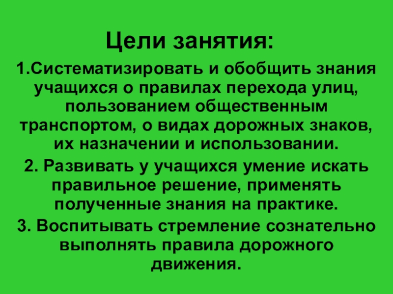 Цели занятия: 1.Систематизировать и обобщить знания учащихся о правилах перехода улиц, пользованием общественным транспортом, о видах дорожных