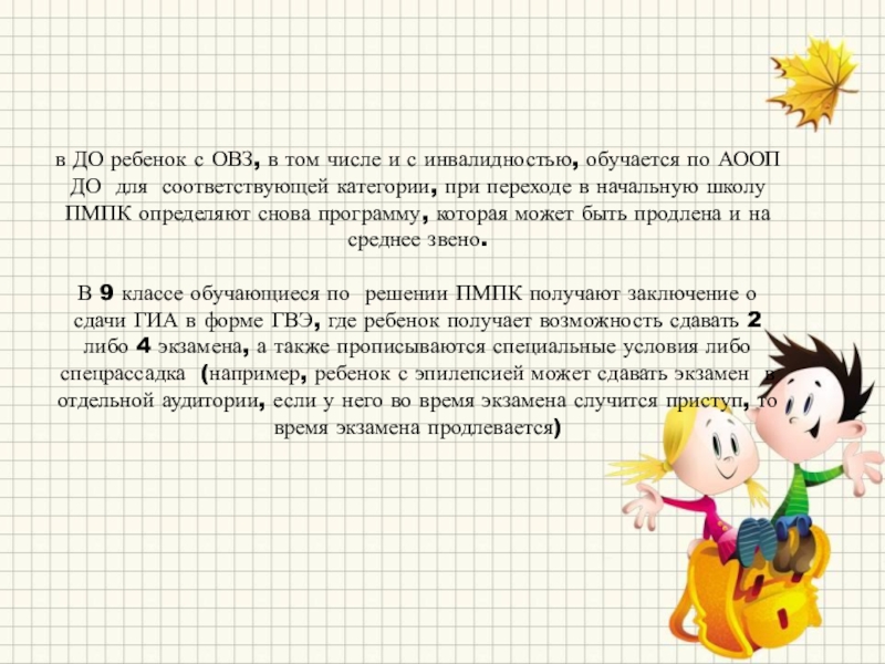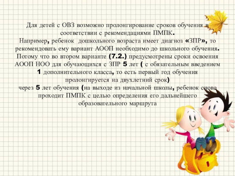 Слайд 26Для детей с ОВЗ возможно пролонгирование сроков обучения в соответствии с