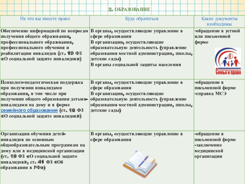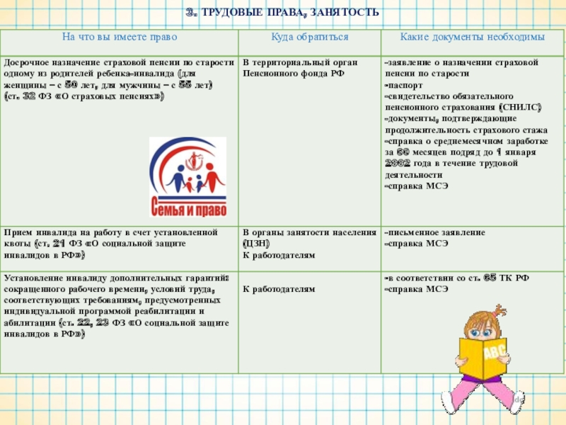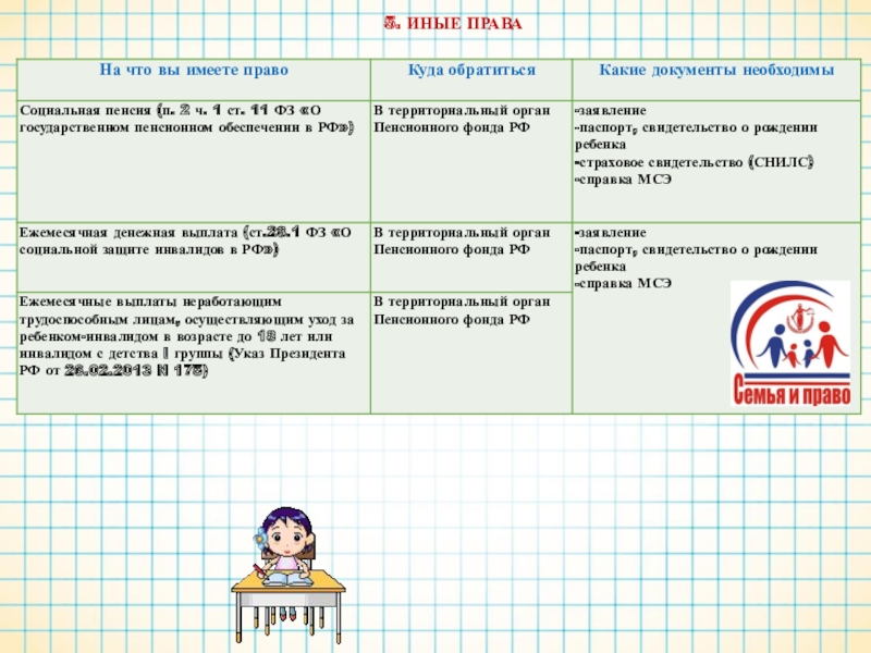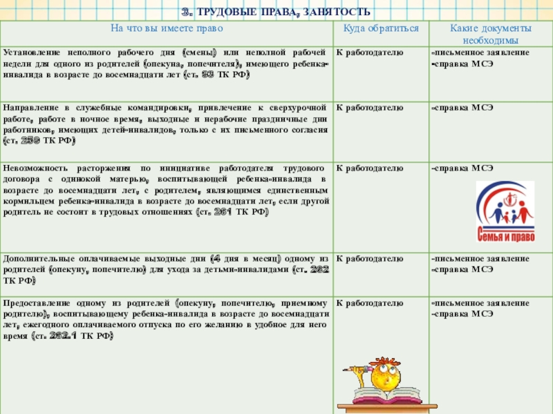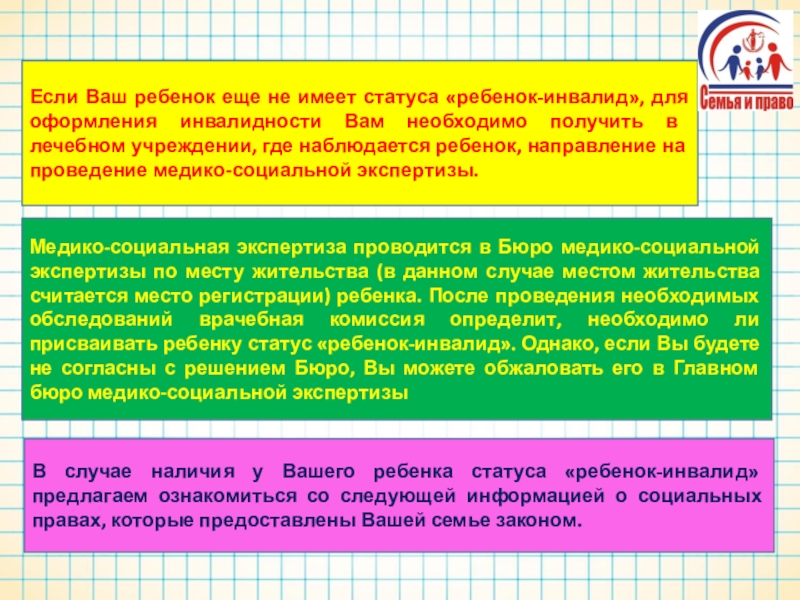 В случае наличия у Вашего ребенка статуса «ребенок-инвалид» предлагаем ознакомиться со следующей информацией о социальных правах, которые предоставлены Вашей семье законом.