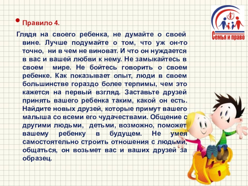 Лучше подумайте о том, что уж он-то точно, ни в чем не виноват. И что он нуждается в вас и вашей любви к нему. Не замыкайтесь в своем мире. Не бойтесь говорить о своем ребенке. Как показывает опыт, люди в своем большинстве гораздо более терпимы, чем это кажется на первый взгляд. Заставьте друзей принять вашего ребенка таким, какой он есть. Найдите новых друзей, которые примут вашего малыша со всеми его чудачествами. Общение с другими людьми, детьми, возможно, поможет вашему ребенку в будущем. Не умея самостоятельно строить отношения с людьми, общаться, он возьмет вас и ваших друзей за образец.