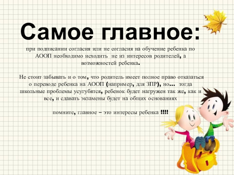 Не стоит забывать и о том, что родитель имеет полное право отказаться о переводе ребенка на АООП (например, для ЗПР), но… тогда школьные проблемы усугубятся, ребенок будет нагружен так же, как и все, и сдавать экзамены будет на общих основаниях