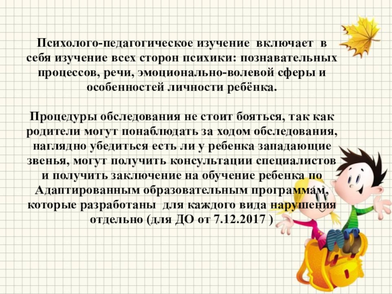 Процедуры обследования не стоит бояться, так как родители могут понаблюдать за ходом обследования, наглядно убедиться есть ли у ребенка западающие звенья, могут получить консультации специалистов и получить заключение на обучение ребенка по Адаптированным образовательным программам, которые разработаны для каждого вида нарушения отдельно (для ДО от 7.12.2017 )