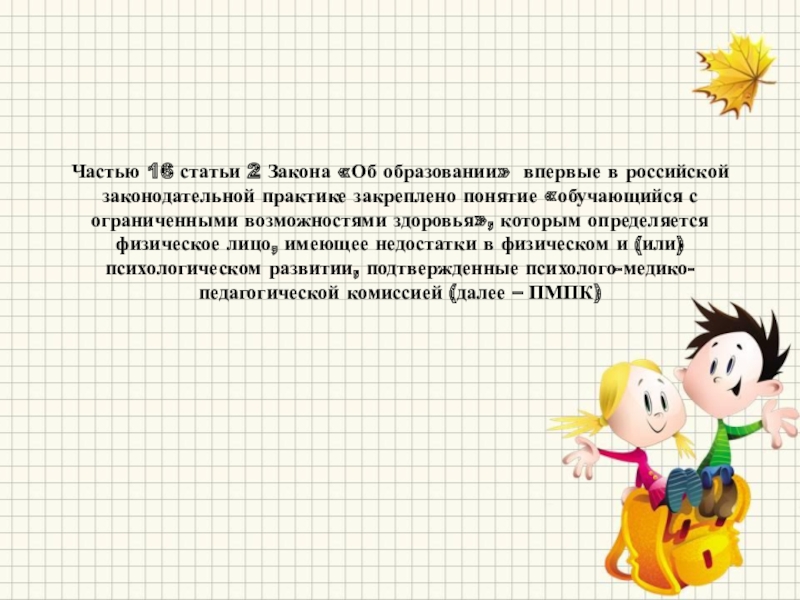 практике закреплено понятие «обучающийся с ограниченными возможностями здоровья», которым определяется физическое лицо, имеющее недостатки в физическом и (или) психологическом развитии, подтвержденные психолого-медико-педагогической комиссией (далее – ПМПК)