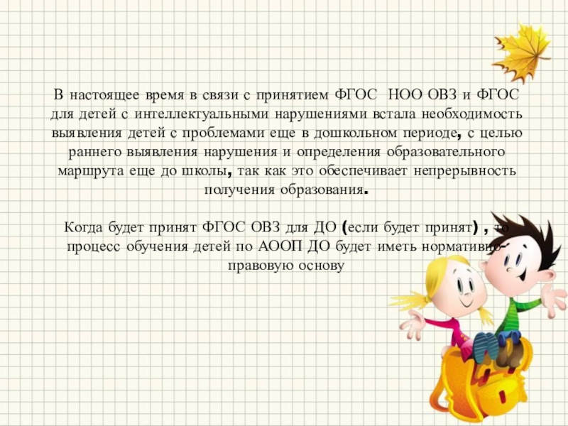 ФГОС для детей с интеллектуальными нарушениями встала необходимость выявления детей с проблемами еще в дошкольном периоде, с целью раннего выявления нарушения и определения образовательного маршрута еще до школы, так как это обеспечивает непрерывность получения образования.