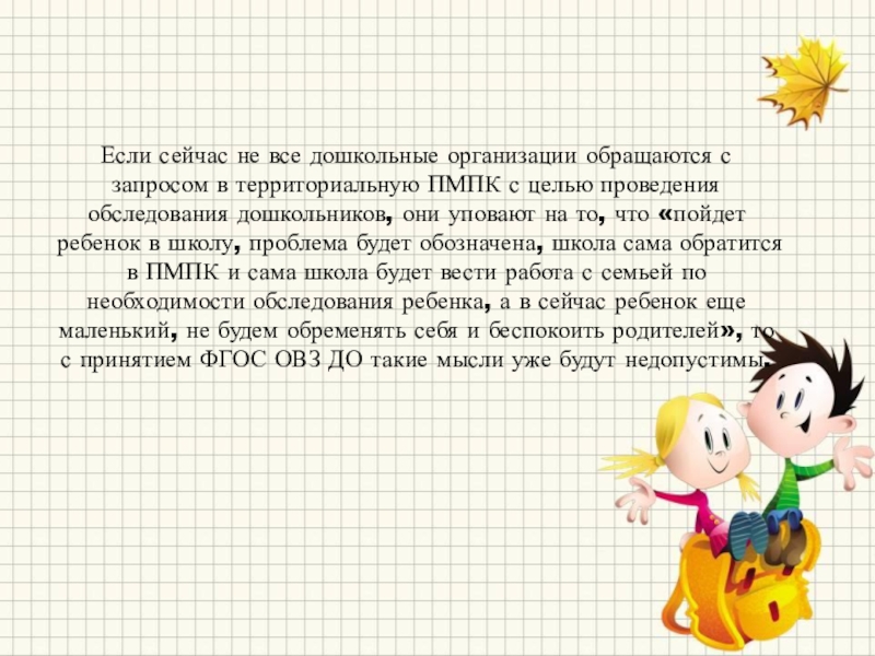 ПМПК с целью проведения обследования дошкольников, они уповают на то, что «пойдет ребенок в школу, проблема будет обозначена, школа сама обратится в ПМПК и сама школа будет вести работа с семьей по необходимости обследования ребенка, а в сейчас ребенок еще маленький, не будем обременять себя и беспокоить родителей», то с принятием ФГОС ОВЗ ДО такие мысли уже будут недопустимы.