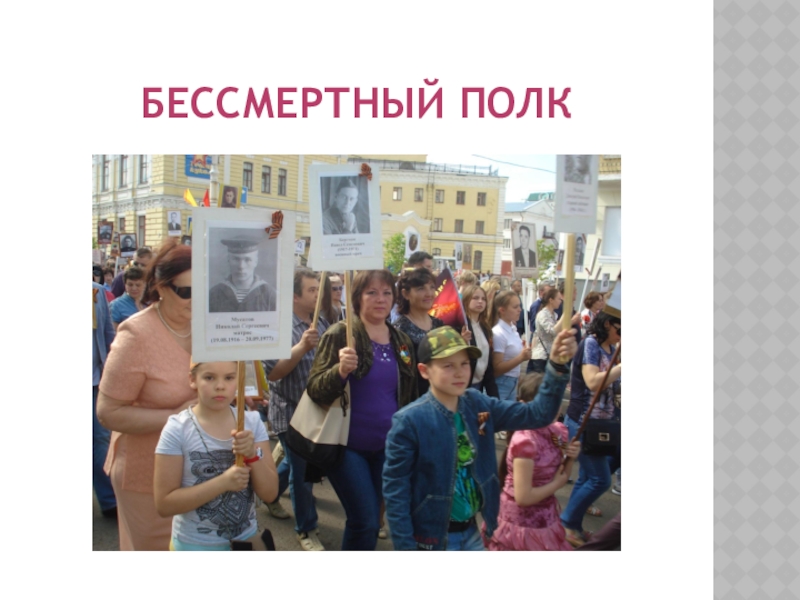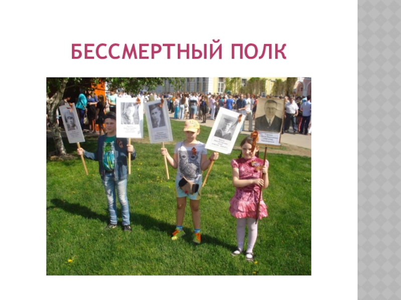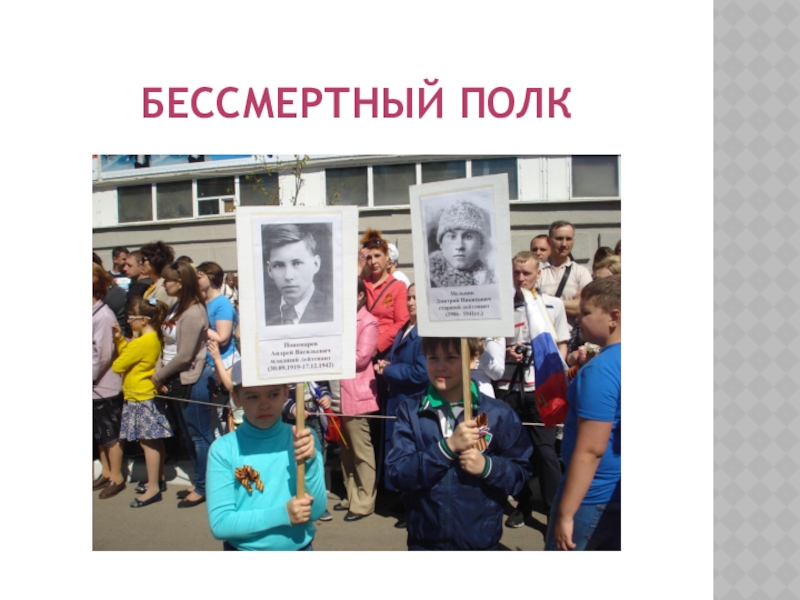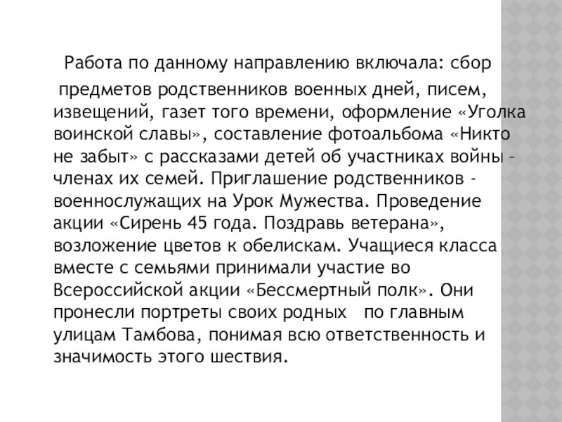 писем, извещений, газет того времени, оформление «Уголка воинской славы», составление фотоальбома «Никто не забыт» с рассказами детей об участниках войны – членах их семей. Приглашение родственников - военнослужащих на Урок Мужества. Проведение акции «Сирень 45 года. Поздравь ветерана», возложение цветов к обелискам. Учащиеся класса вместе с семьями принимали участие во Всероссийской акции «Бессмертный полк». Они пронесли портреты своих родных по главным улицам Тамбова, понимая всю ответственность и значимость этого шествия.