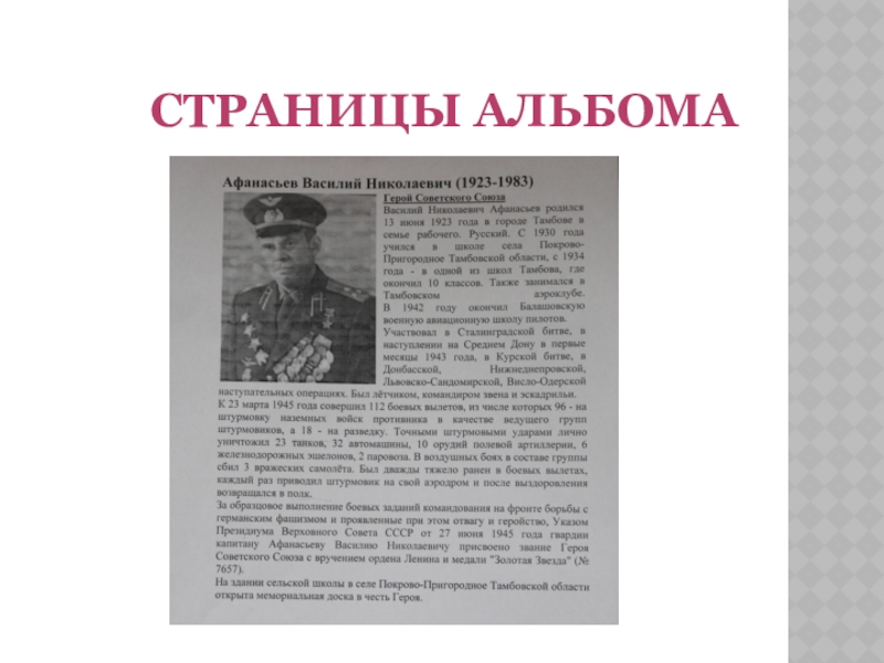 Работа по данному направлению включала: сбор предметов родственников военных дней, писем, извещений, газет того времени, оформление «Уголка воинской славы», составление фотоальбома «Никто не забыт» с рассказами детей об участниках войны – членах их семей. Приглашение