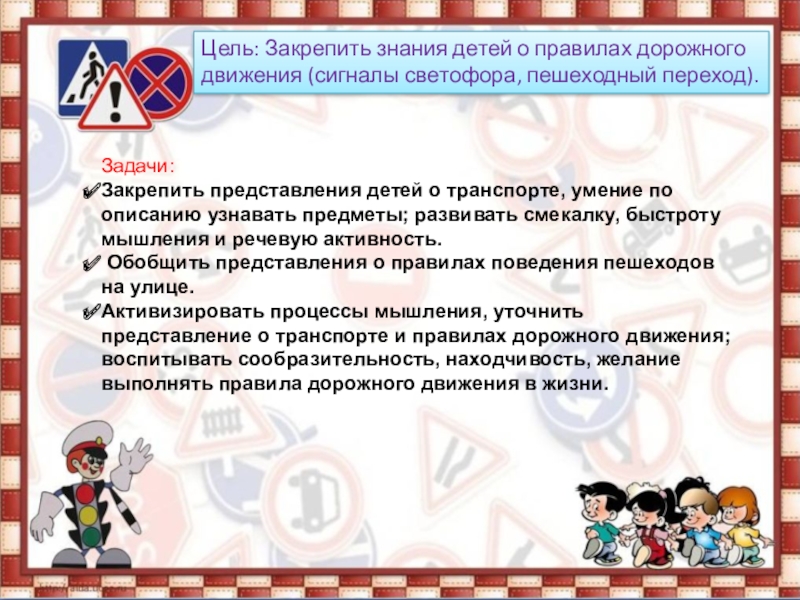 Активизировать процессы мышления, уточнить представление о транспорте и правилах дорожного движения; воспитывать сообразительность, находчивость, желание выполнять правила дорожного движения в жизни.