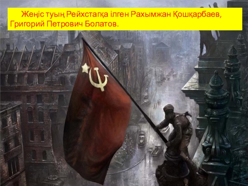 Слайд 21 Жеңіс туың Рейхстагқа ілген Рахымжан Қошқарбаев,Григорий Петрович Болатов.