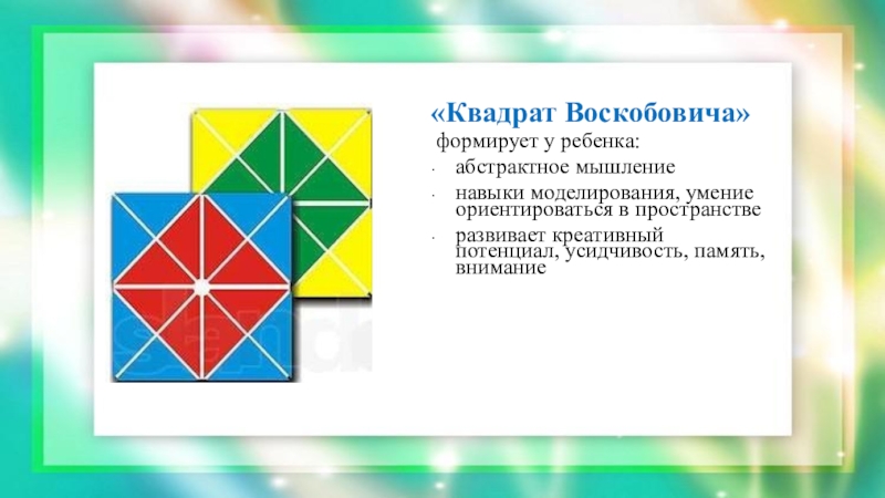 «Квадрат Воскобовича» формирует у ребенка:абстрактное мышлениенавыки моделирования, умение ориентироваться в пространстверазвивает креативный потенциал, усидчивость, память, внимание