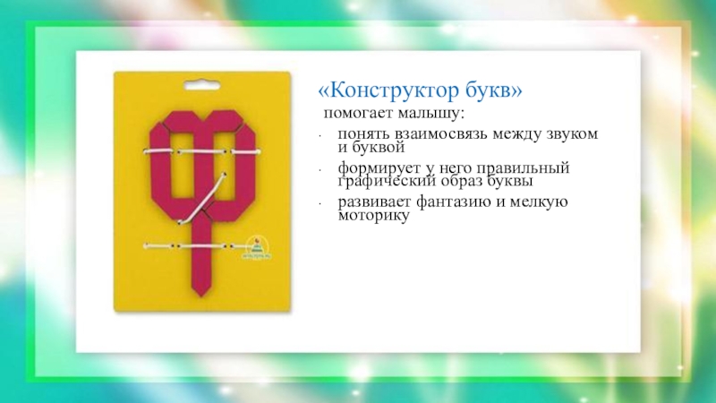 «Конструктор букв» помогает малышу:понять взаимосвязь между звуком и буквойформирует у него правильный графический образ буквыразвивает фантазию и мелкую моторику