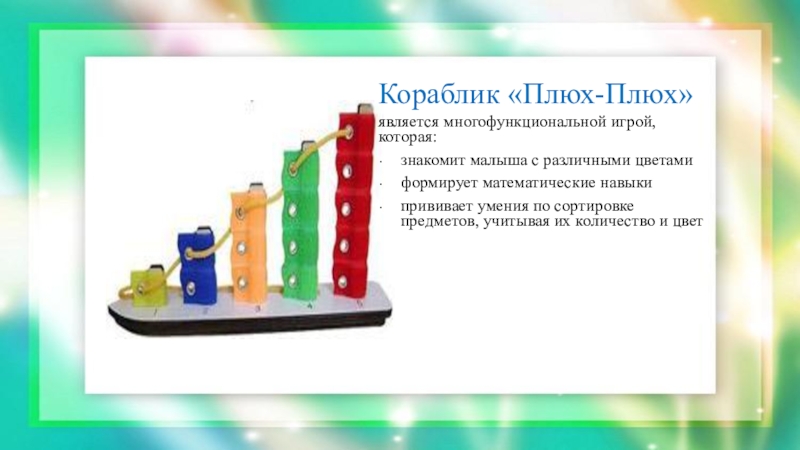 Кораблик «Плюх-Плюх» является многофункциональной игрой, которая:знакомит малыша с различными цветамиформирует математические навыки прививает умения по сортировке предметов, учитывая их количество и цвет