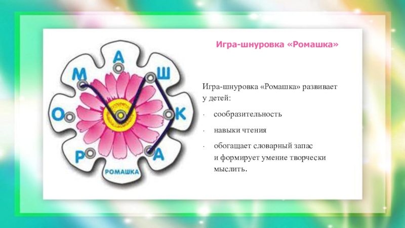 Игра-шнуровка «Ромашка»Игра-шнуровка «Ромашка» развивает у детей:сообразительностьнавыки чтенияобогащает словарный запас и формирует умение творчески мыслить.