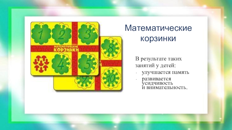 В результате таких занятий у детей:улучшается памятьразвивается усидчивость и внимательность. Математические корзинки