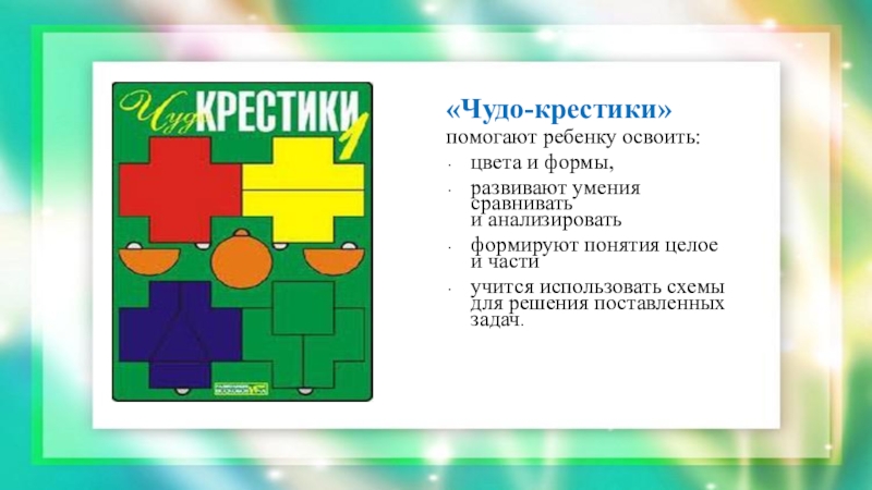 «Чудо-крестики» помогают ребенку освоить:цвета и формы,развивают умения сравнивать и анализироватьформируют понятия целое и частиучится использовать схемы для решения поставленных задач.