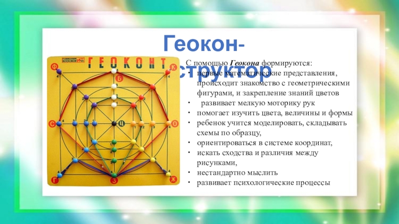 Геокон-конструкторС помощью Геокона формируются:первые математические представления, происходит знакомство с геометрическими фигурами, и закрепление знаний цветов развивает мелкую