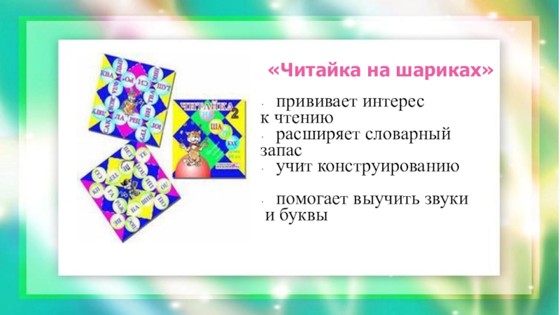 «Читайка на шариках»прививает интерес к чтениюрасширяет словарный запас учит конструированию помогает выучить звуки и буквы