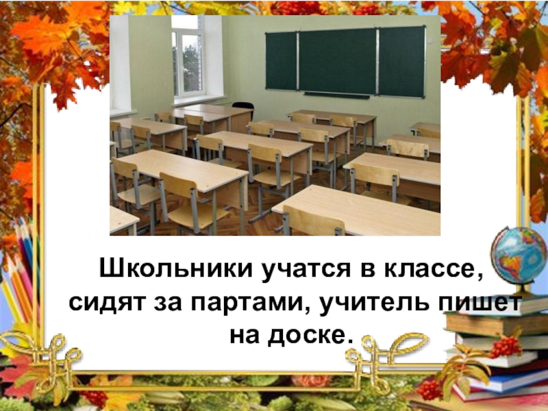 Школьники учатся в классе, сидят за партами, учитель пишет на доске.