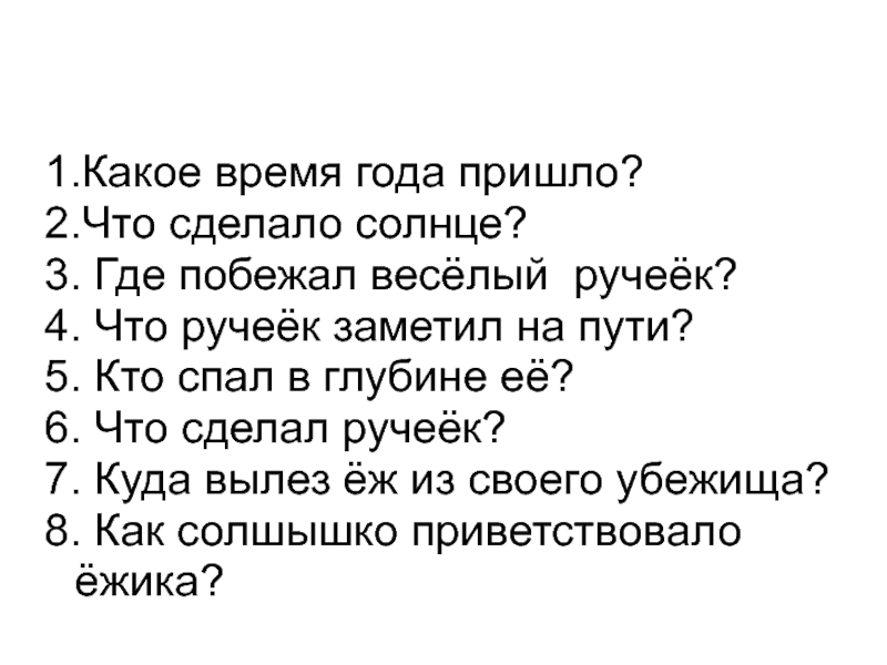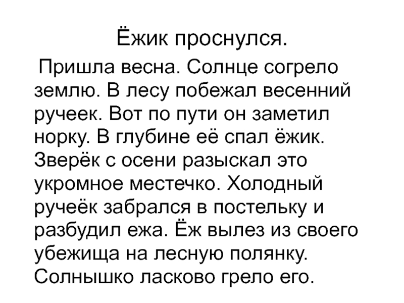 весенний ручеек. Вот по пути он заметил норку. В глубине её спал ёжик. Зверёк с осени разыскал это укромное местечко. Холодный ручеёк забрался в постельку и разбудил ежа. Ёж вылез из своего убежища на лесную полянку.Солнышко ласково грело его.