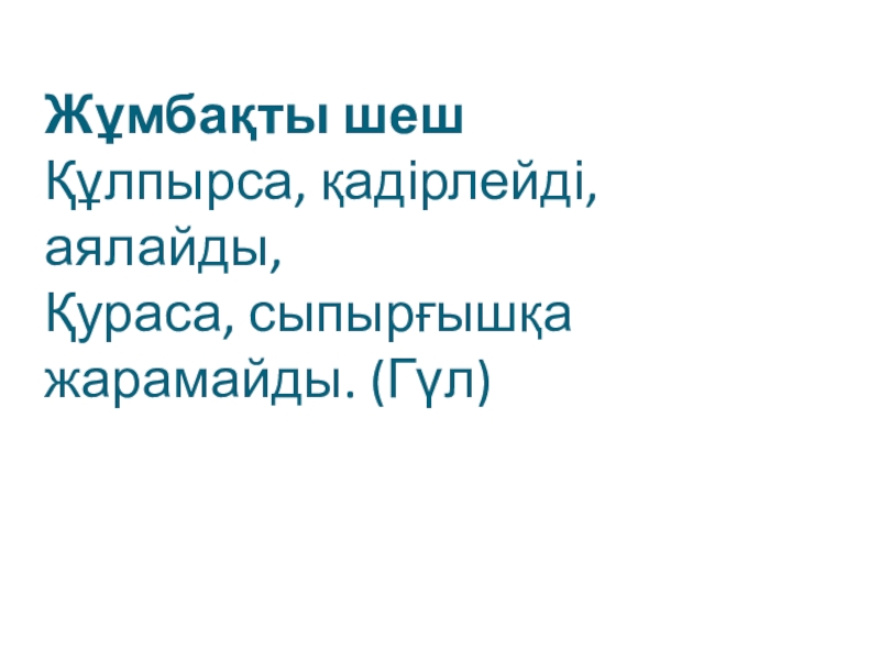 Слайд 4Жұмбақты шеш Құлпырса, қадірлейді, аялайды, Қураса, сыпырғышқа жарамайды. (Гүл)