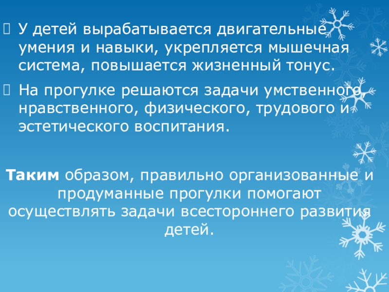 На прогулке решаются задачи умственного, нравственного, физического, трудового и эстетического воспитания.