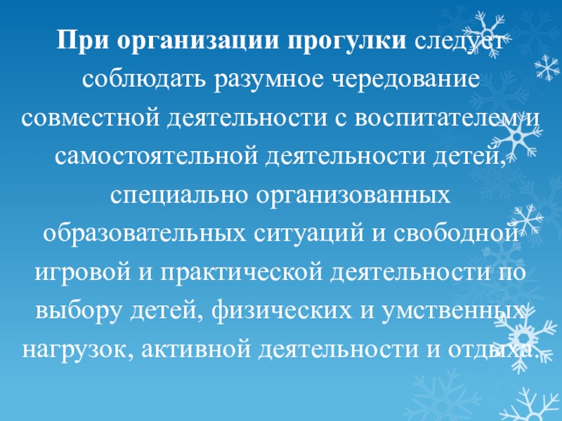 Слайд 13При организации прогулки следует соблюдать разумное чередование совместной деятельности с воспитателем